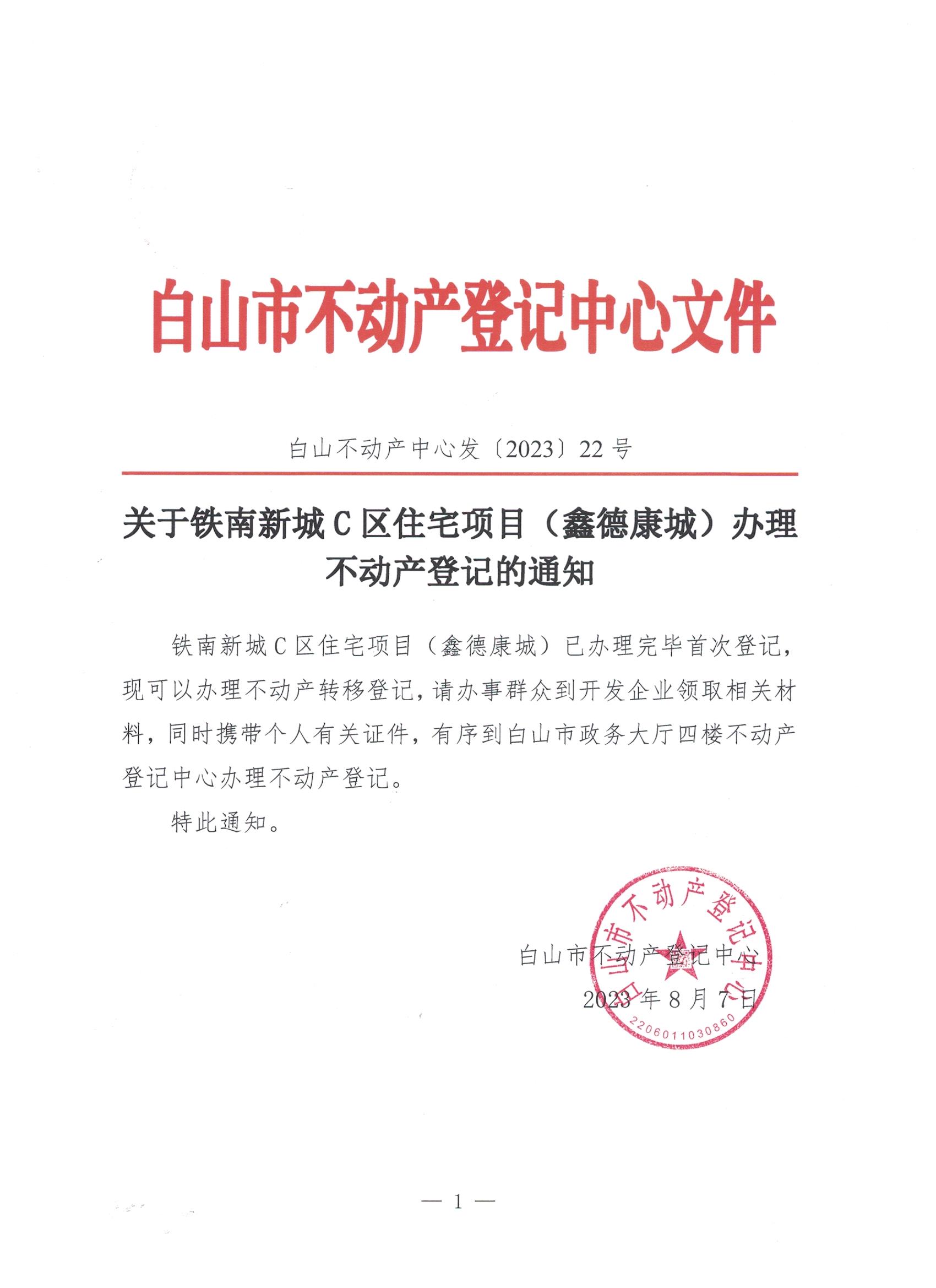关于铁南新城C区住宅项目(鑫德康城)办理不动产登记的通知