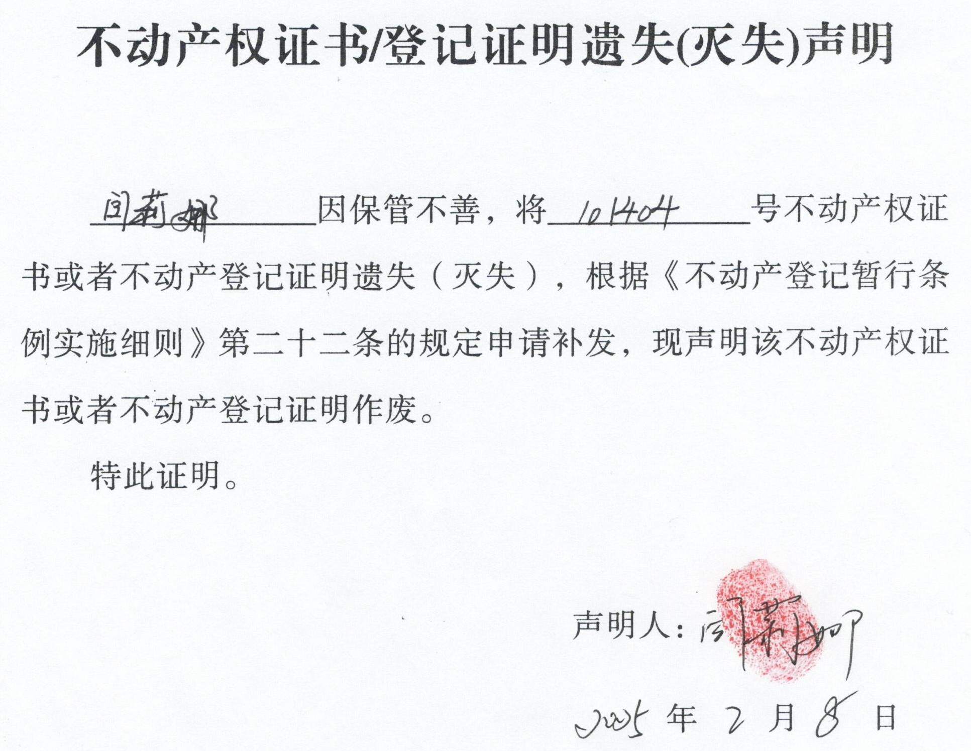 关于 闫莉娜 不动产权证书/登记证明 遗失(灭失)声明