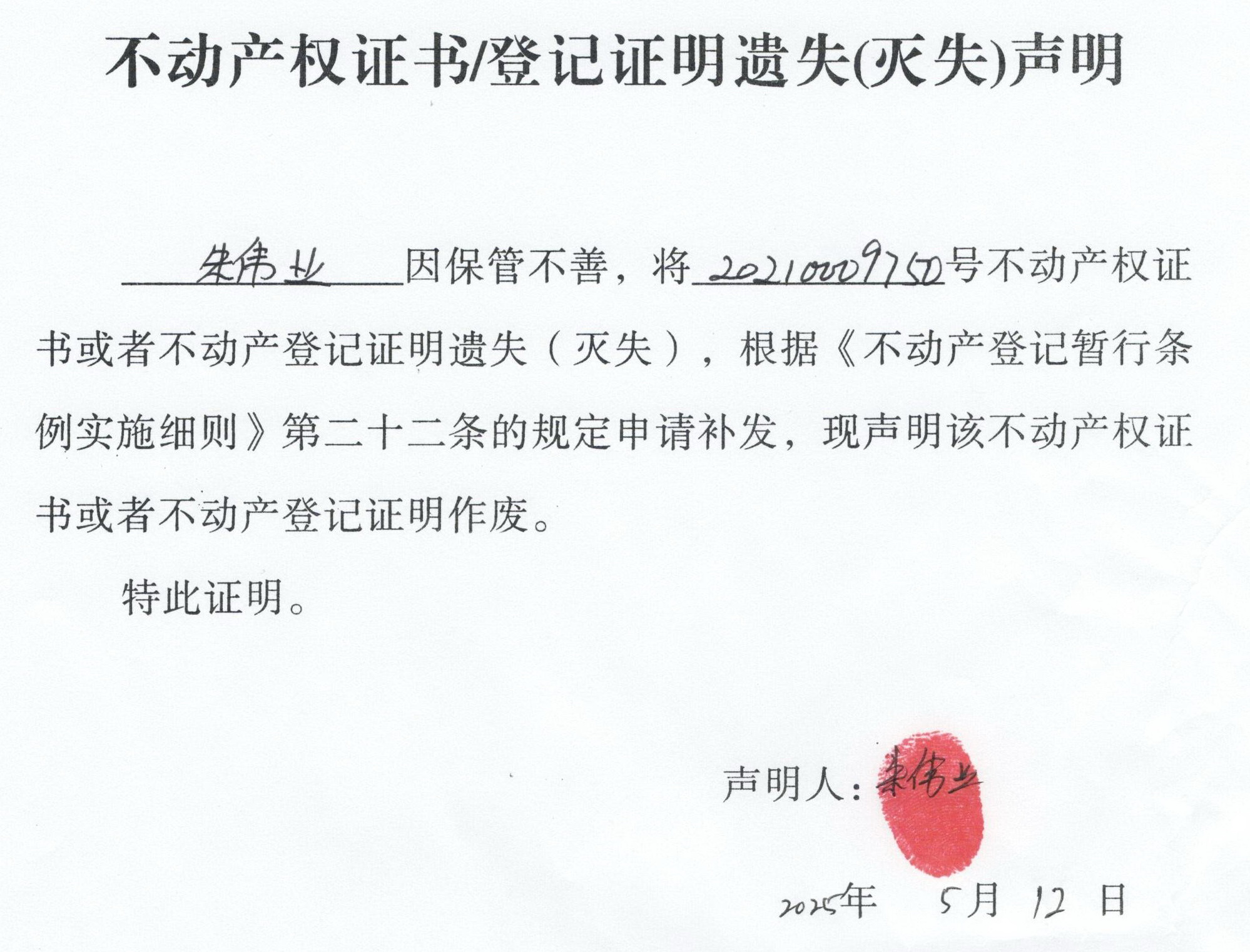 关于 朱伟业 不动产权证书/登记证明 遗失(灭失)声明