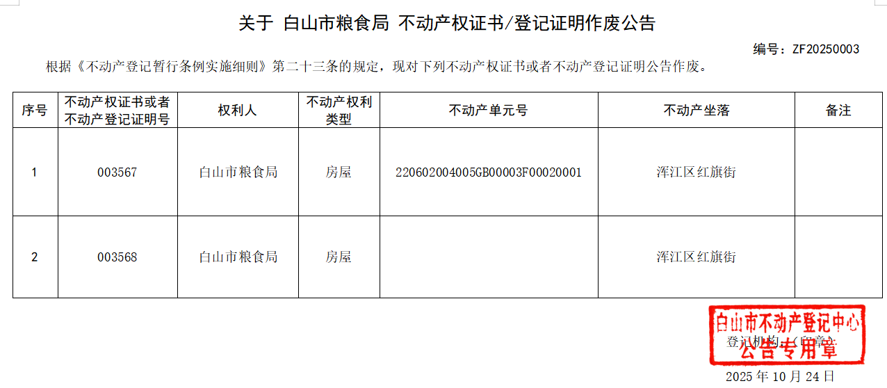 关于 白山市粮食局 不动产权证书/登记证明作废公告