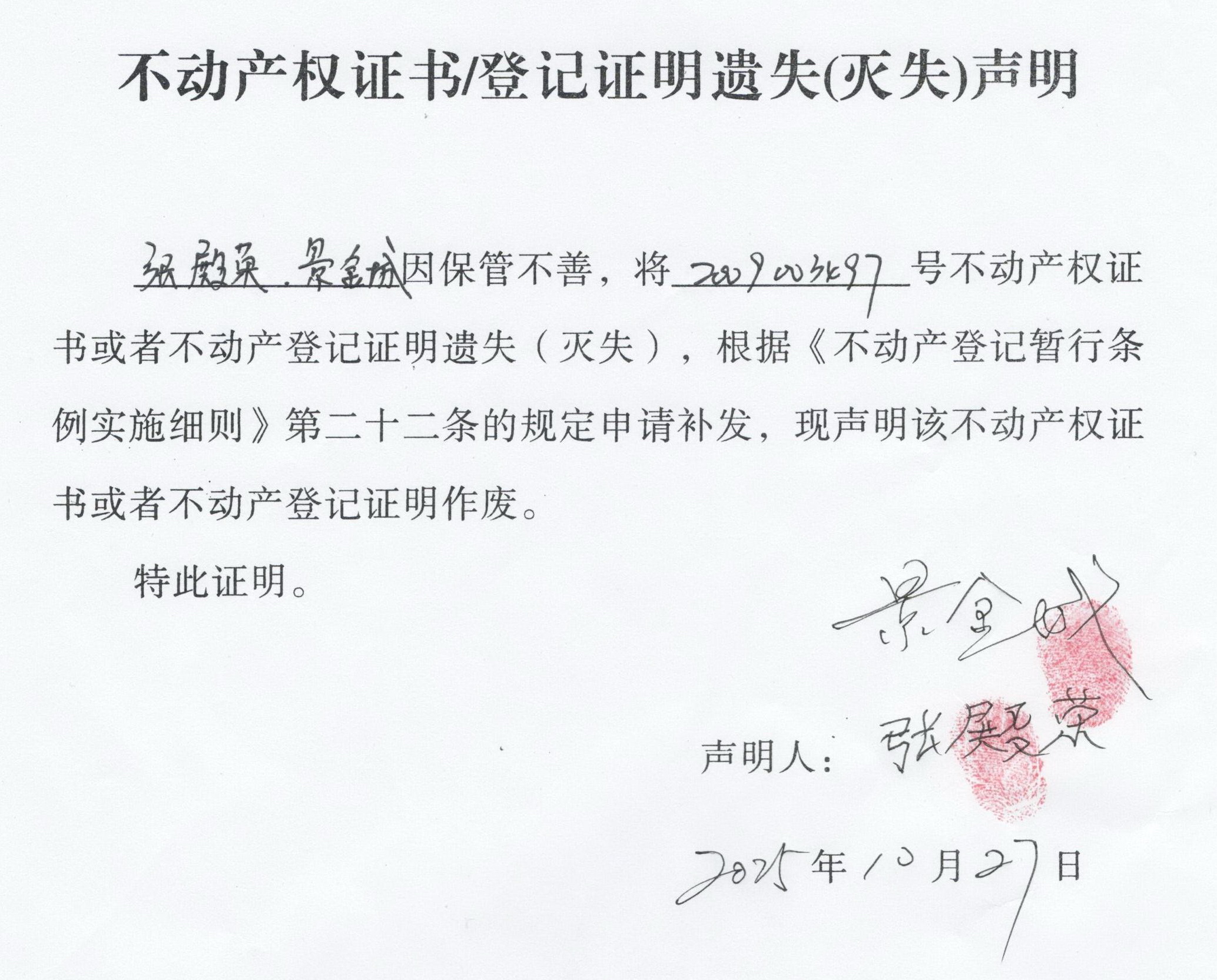 关于 张殿荣 景金城 不动产权证书/登记证明 遗失(灭失)声明