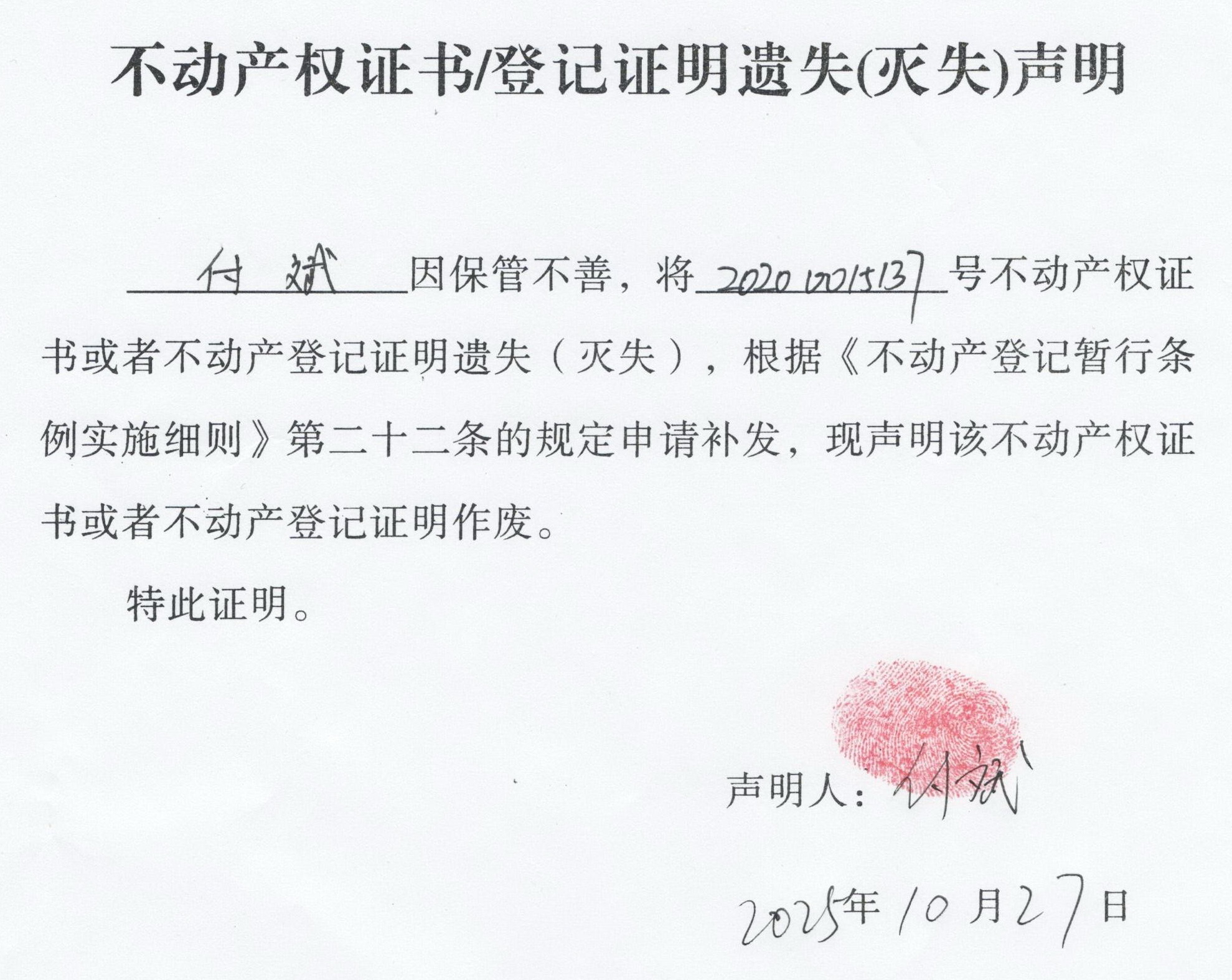 关于 付斌 不动产权证书/登记证明 遗失(灭失)声明