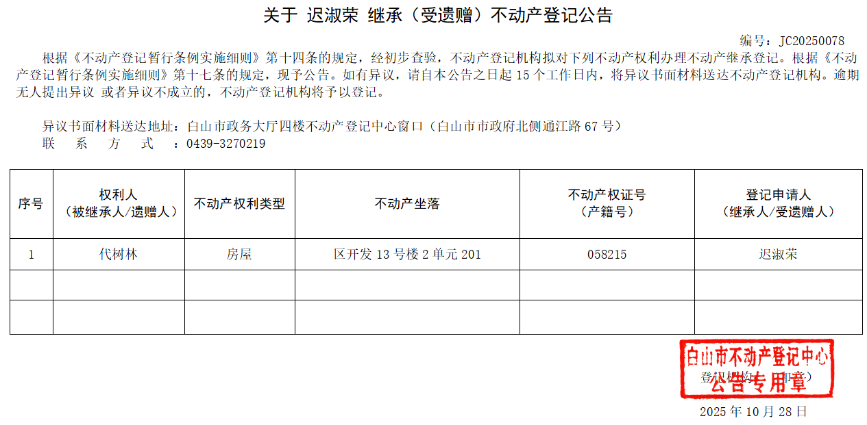 关于 迟淑荣 继承(受遗赠)不动产登记公告