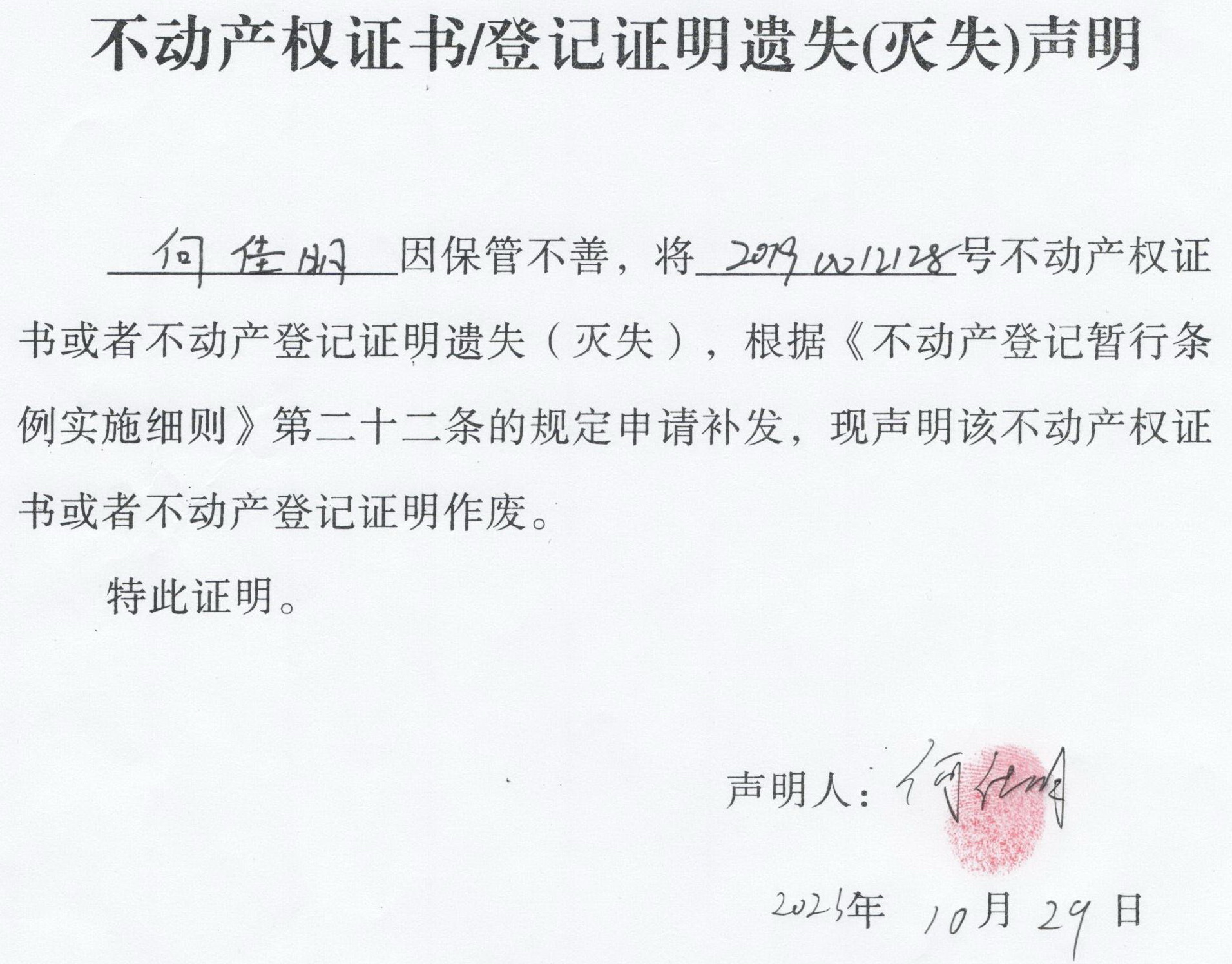 关于 何佳明 不动产权证书/登记证明 遗失(灭失)声明