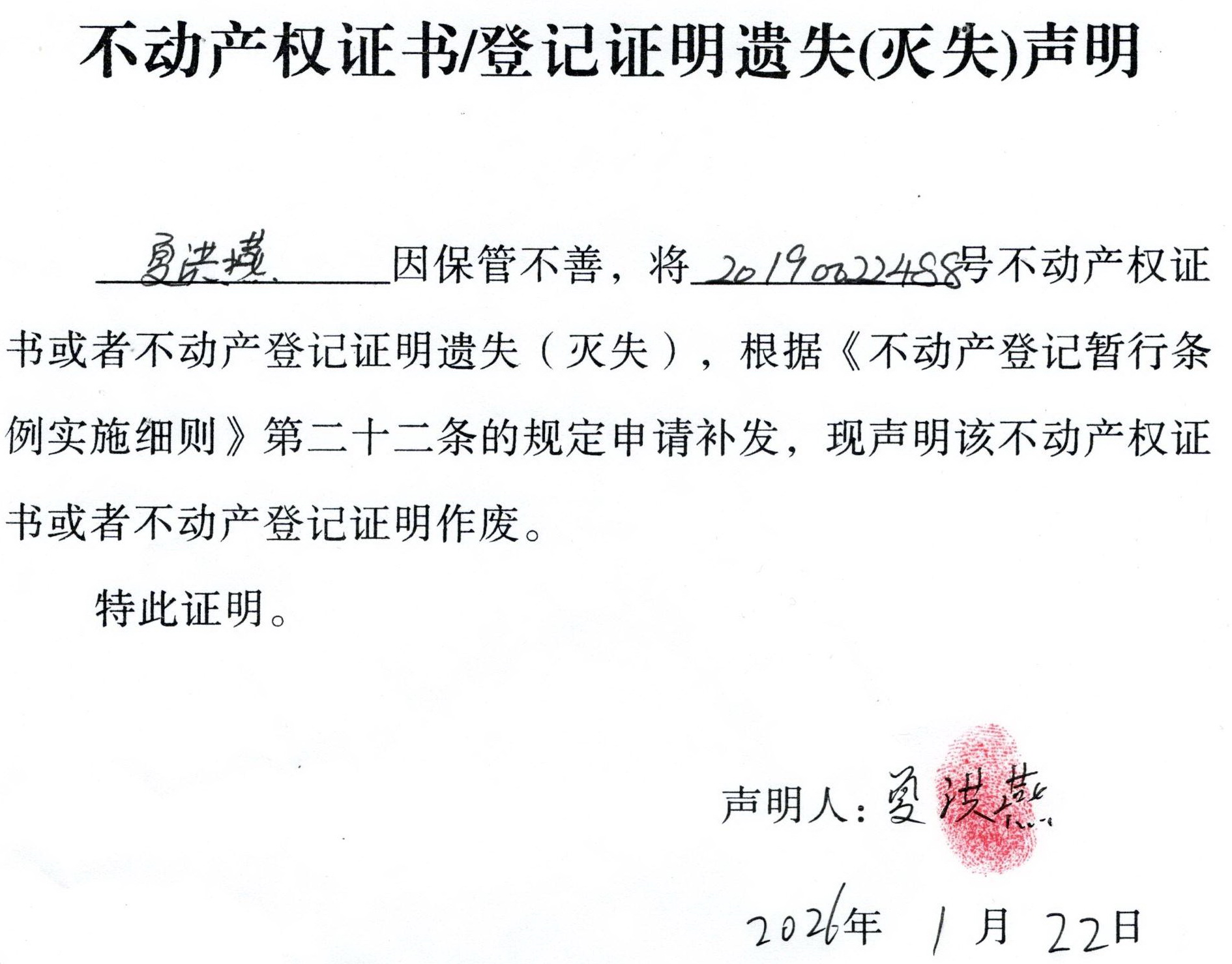 关于 夏洪燕 不动产权证书/登记证明 遗失(灭失)声明