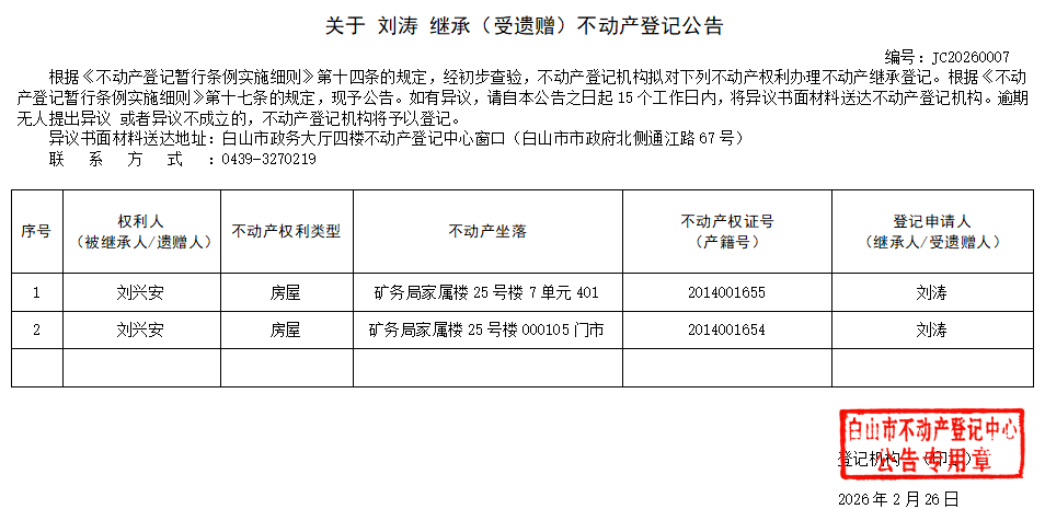 关于 刘涛 继承(受遗赠)不动产登记公告