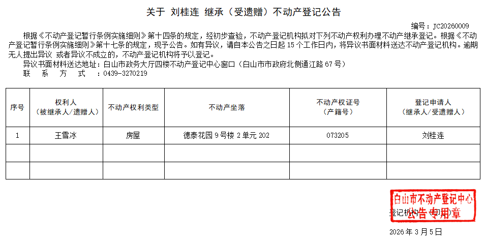 关于 刘桂连 继承(受遗赠)不动产登记公告