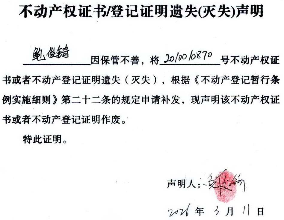 关于 鲍俊锜 不动产权证书/登记证明 遗失(灭失)声明