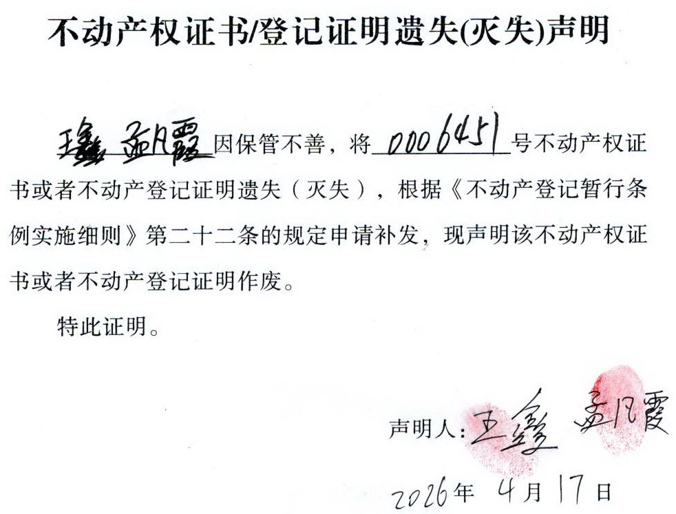 关于 王鑫、孟凡霞 不动产权证书/登记证明 遗失(灭失)声明