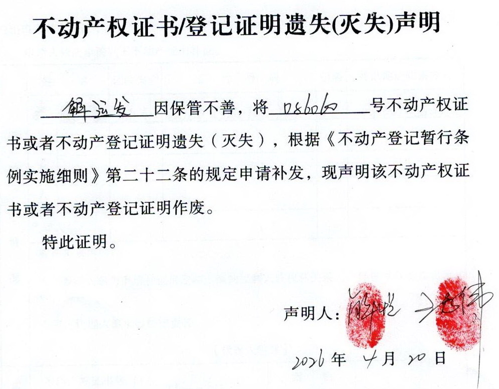 关于 解运发 不动产权证书/登记证明 遗失(灭失)声明