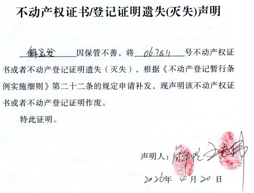 关于 解运发 不动产权证书/登记证明 遗失(灭失)声明