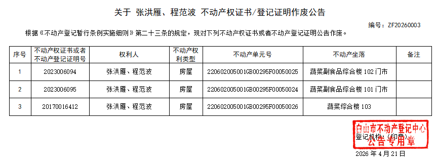 关于 张洪雁、程范波 不动产权证书/登记证明作废公告
