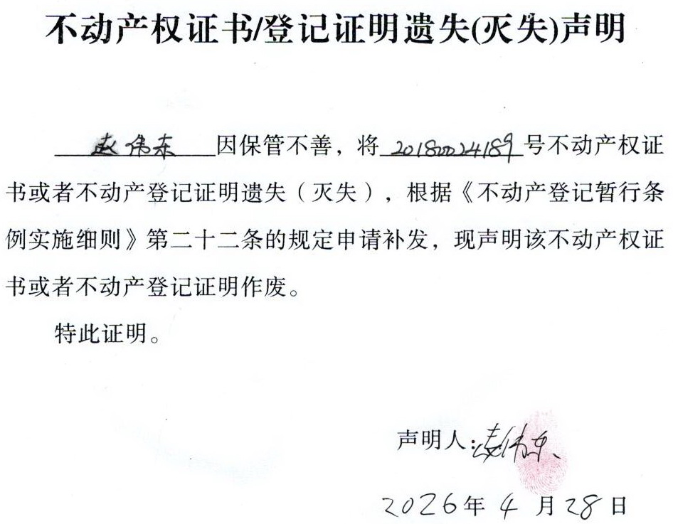 关于 赵伟东 不动产权证书/登记证明 遗失(灭失)声明