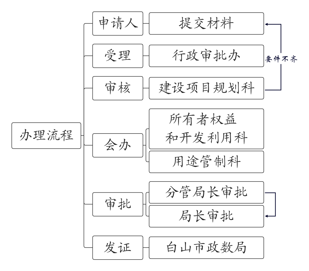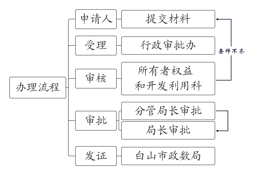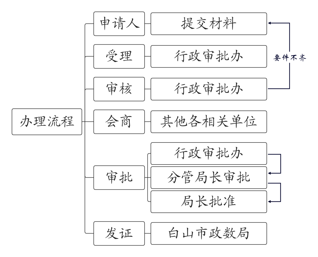 答:流程如下图,在要件齐全情况下5个工作日即可办结。