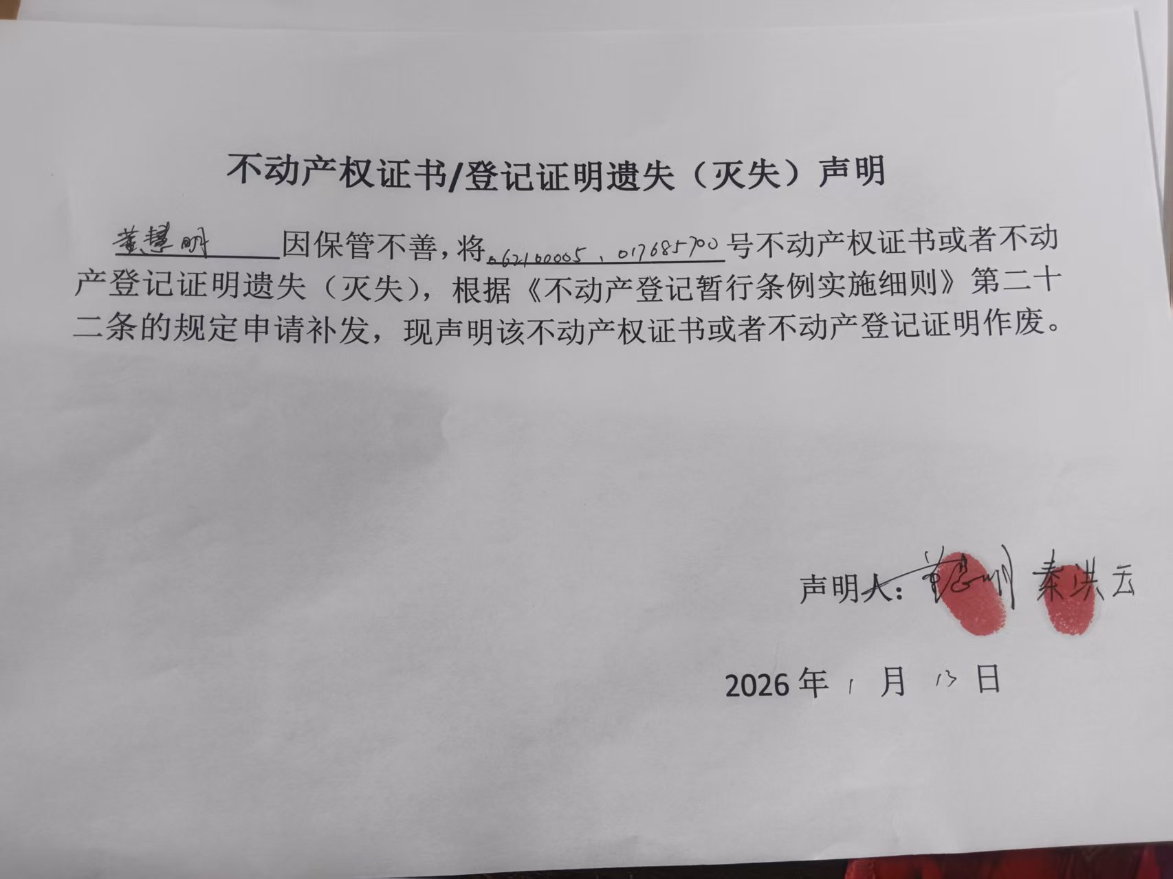 不动产权证书/登记证明遗失(灭失)声明