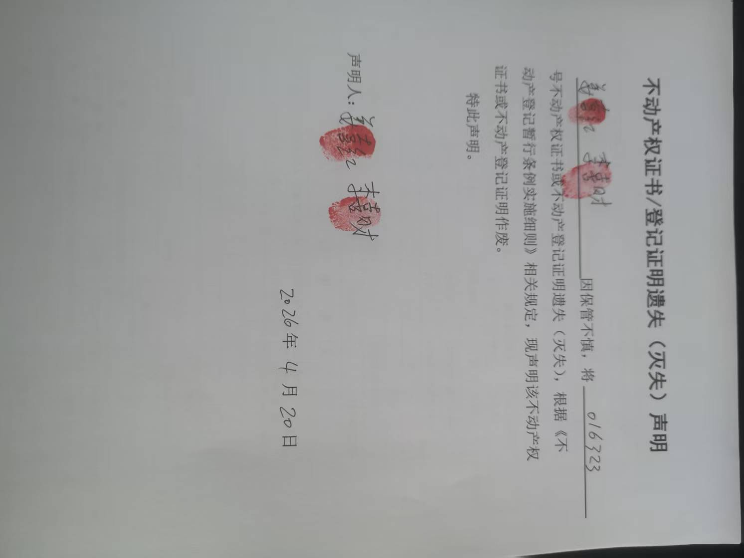 不动产权证书/登记证明遗失(灭失)声明
