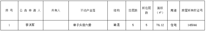 经初步审定,我机构拟对下列不动产权予以丢失补证公告,根据《不动产登记暂行条例实施细则》第十七条、第二十二条的规定,现予以公告。如有异议,请自本公告之日起1个工作日内将异议书面材料送达我机构。逾期无人提出异议或者异议不成立的,我机构将作废原房屋所有权证,予以申请人办理不动产权丢失补证登记。