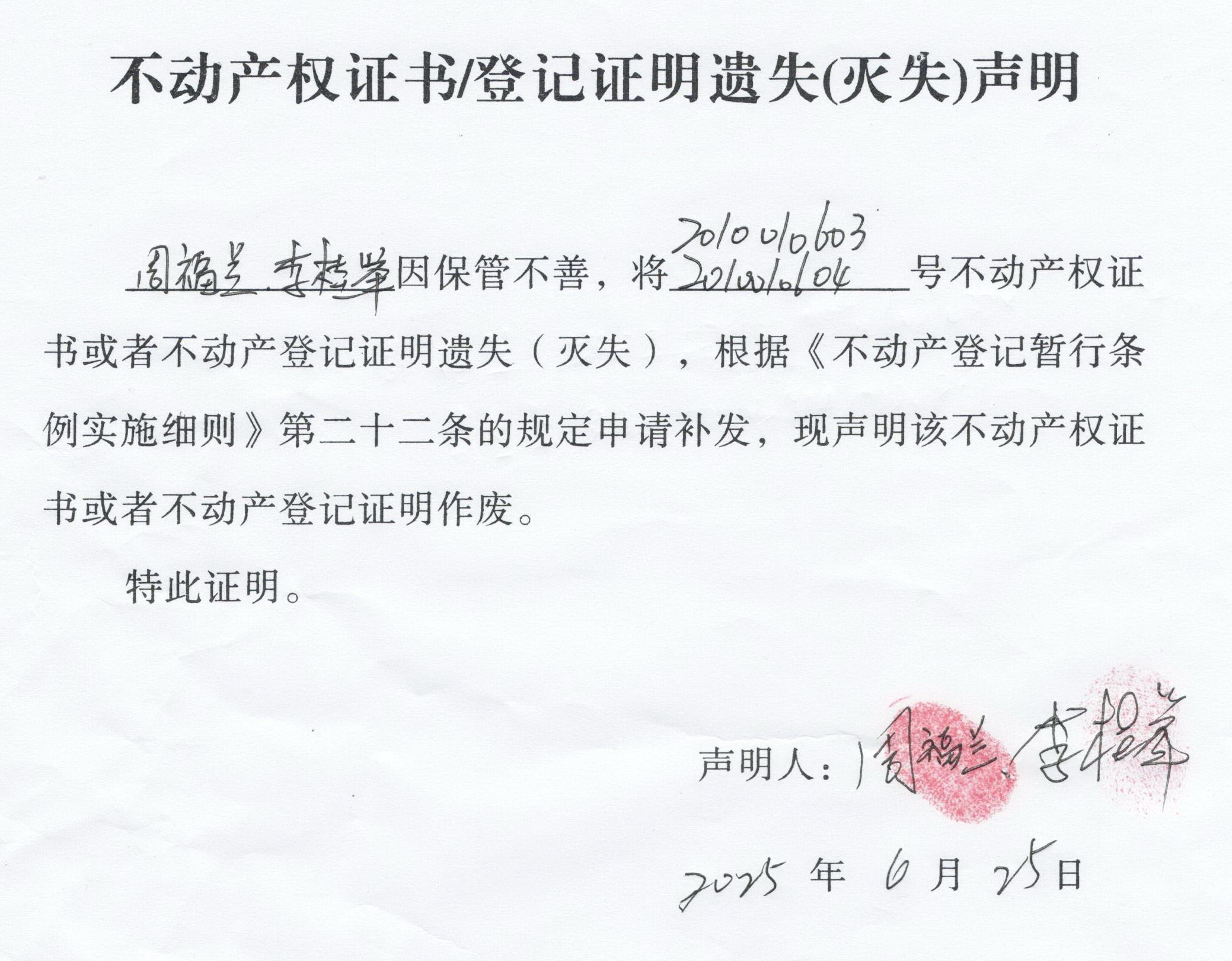 关于 周福兰 李桂举 不动产权证书/登记证明 遗失(灭失)声明