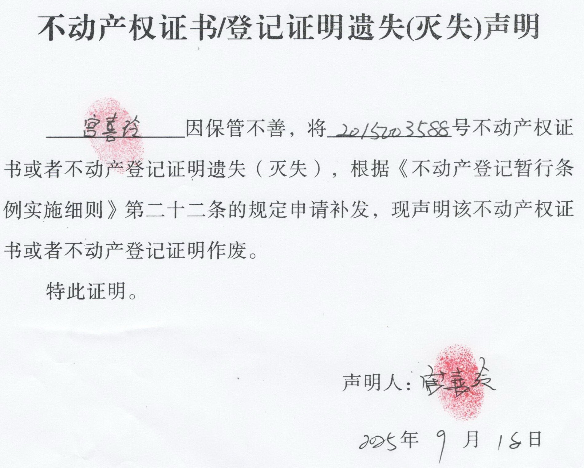 关于 宫喜玲 不动产权证书/登记证明 遗失(灭失)声明