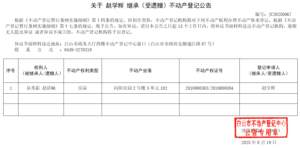 关于 赵学辉 继承(受遗赠)不动产登记公告