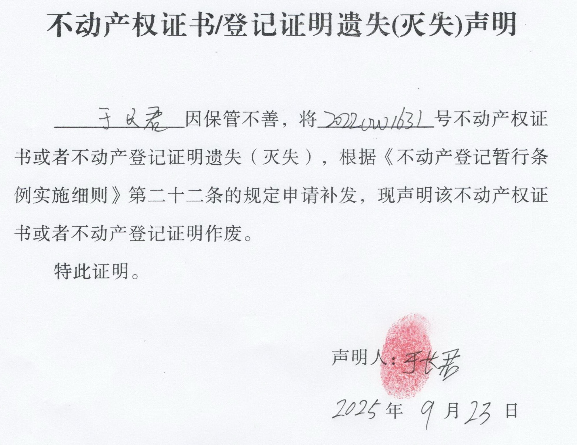 关于 于长君 不动产权证书/登记证明 遗失(灭失)声明