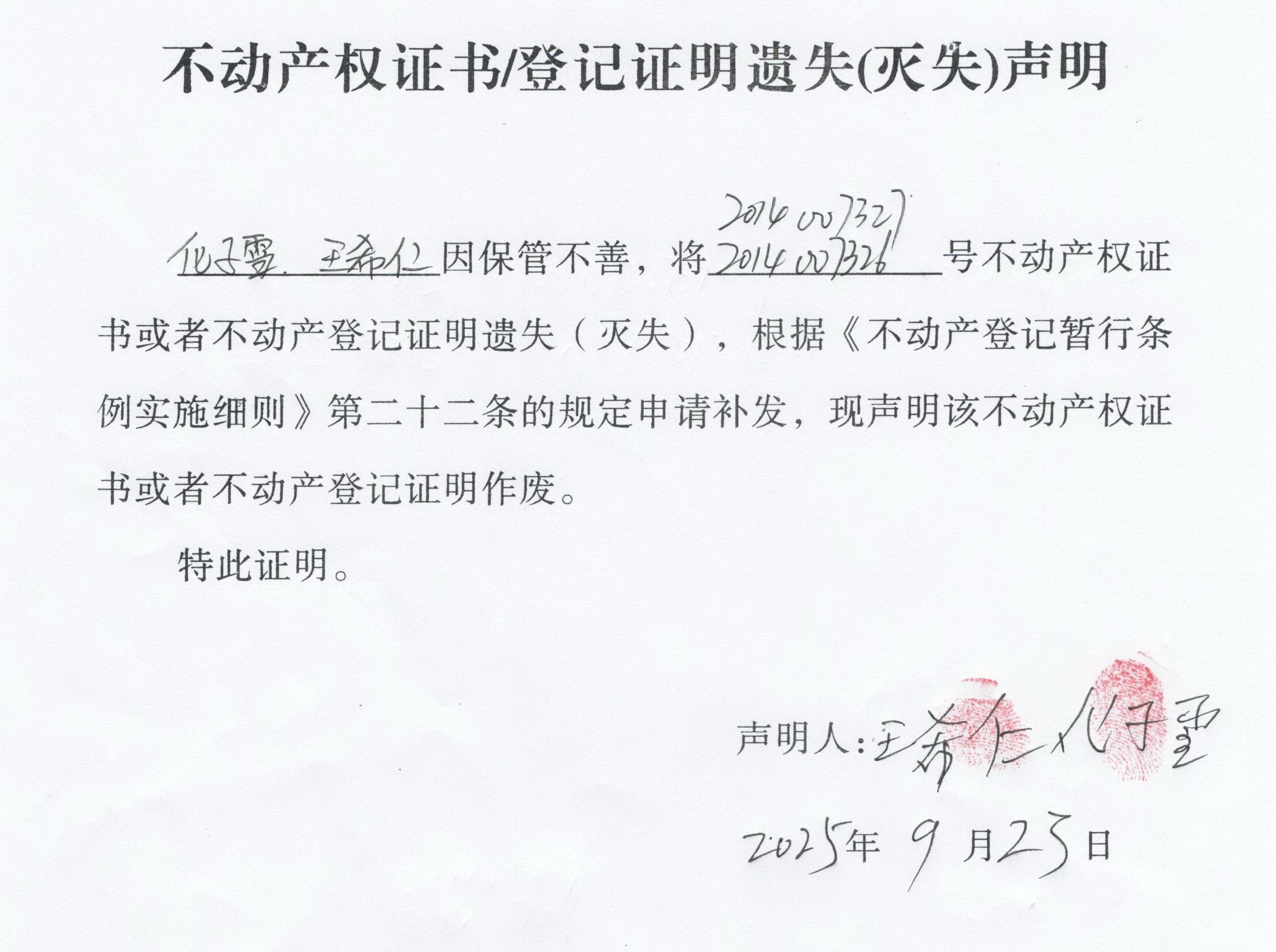 关于 化子雪 王希仁 不动产权证书/登记证明 遗失(灭失)声明