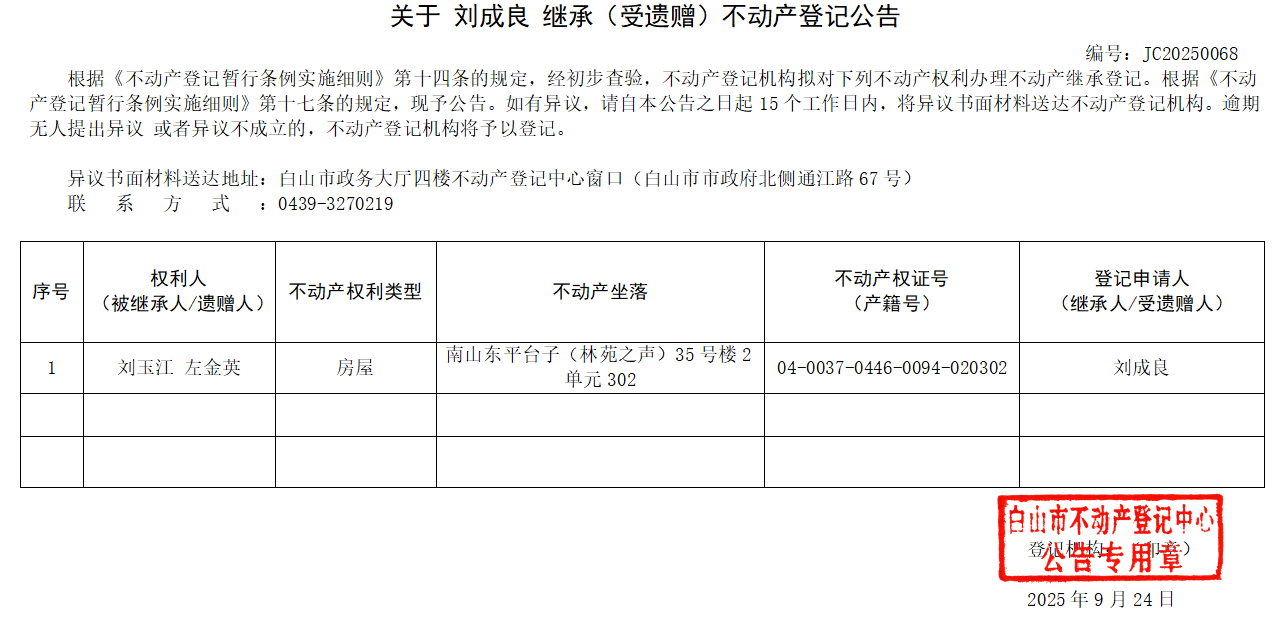 关于 刘成良 继承(受遗赠)不动产登记公告