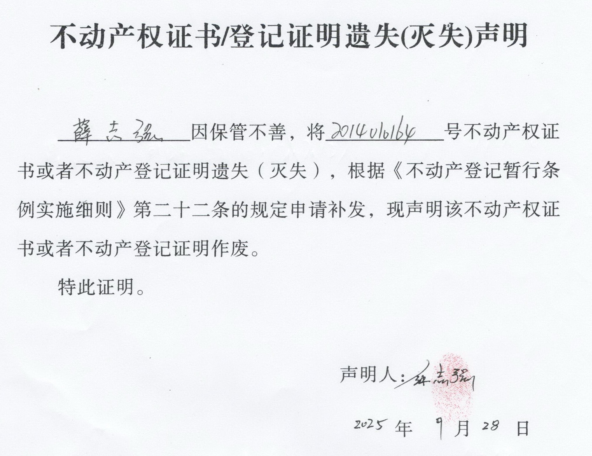关于 薛志强 不动产权证书/登记证明 遗失(灭失)声明