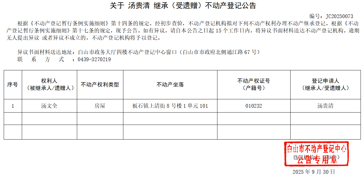 关于 汤贵清 继承(受遗赠)不动产登记公告