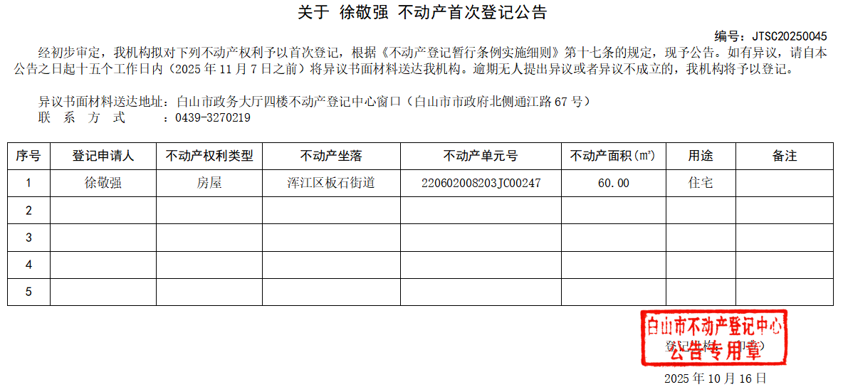 发布时间:2025-10-16 信息来源:白山市不动产登记中心 收藏