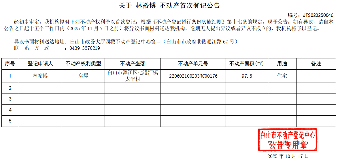 发布时间:2025-10-17 信息来源:白山市不动产登记中心 收藏