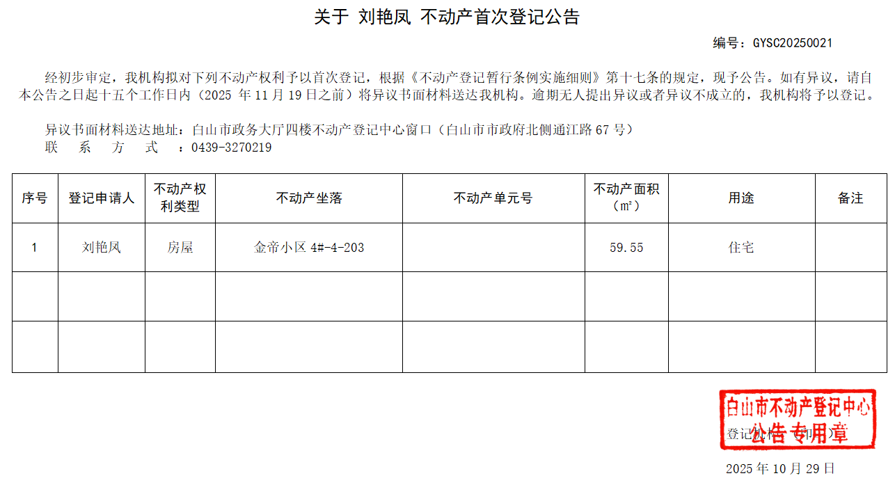 关于 刘艳凤 不动产首次登记公告
