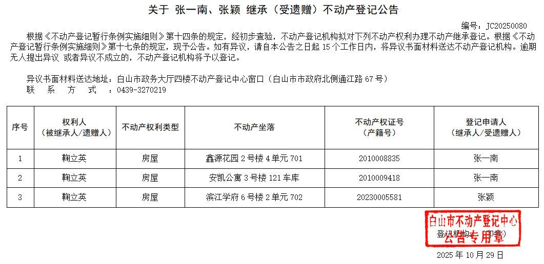 发布时间:2025-10-29 信息来源:白山市不动产登记中心 收藏