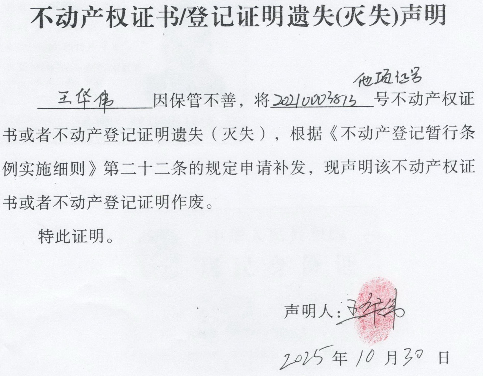 关于 王华伟 不动产权证书/登记证明 遗失(灭失)声明