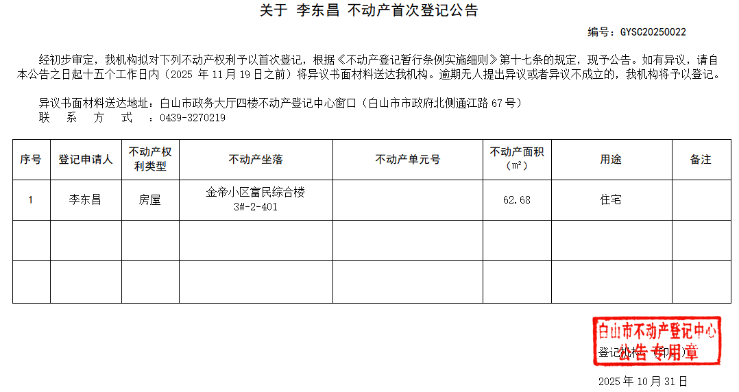 发布时间:2025-10-31 信息来源:白山市不动产登记中心 收藏