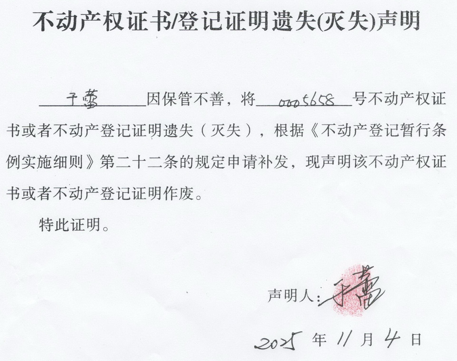关于 于蕾 不动产权证书/登记证明 遗失(灭失)声明