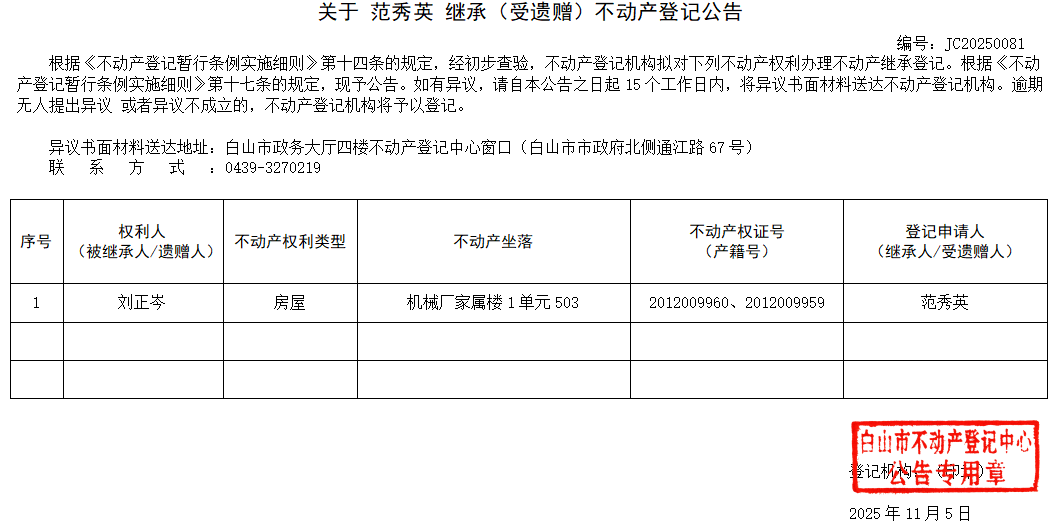 发布时间:2025-11-05 信息来源:白山市不动产登记中心 收藏