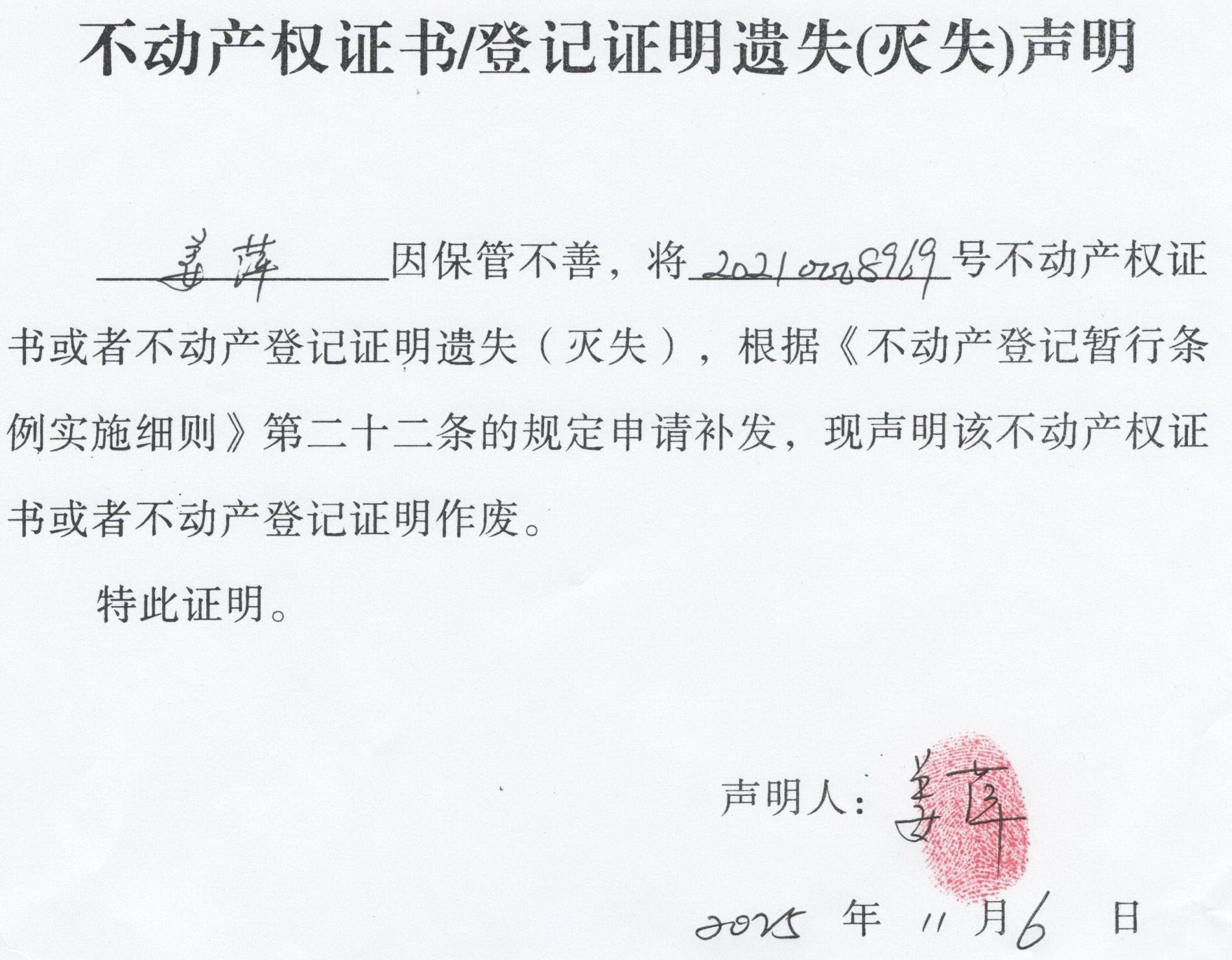 关于 姜萍 不动产权证书/登记证明 遗失(灭失)声明