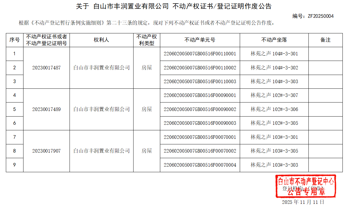 关于 白山市丰润置业有限公司 不动产权证书/登记证明作废公告