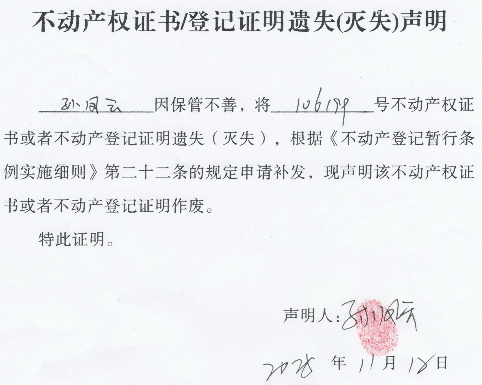 关于 孙凤云 不动产权证书/登记证明 遗失(灭失)声明