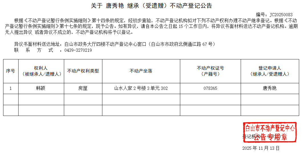 发布时间:2025-11-13 信息来源:白山市不动产登记中心 收藏