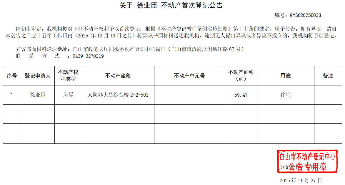 发布时间:2025-11-27 信息来源:白山市不动产登记中心 收藏