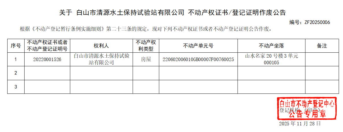 关于 白山市清源水土保持试验站有限公司 不动产权证书/登记证明作废公告