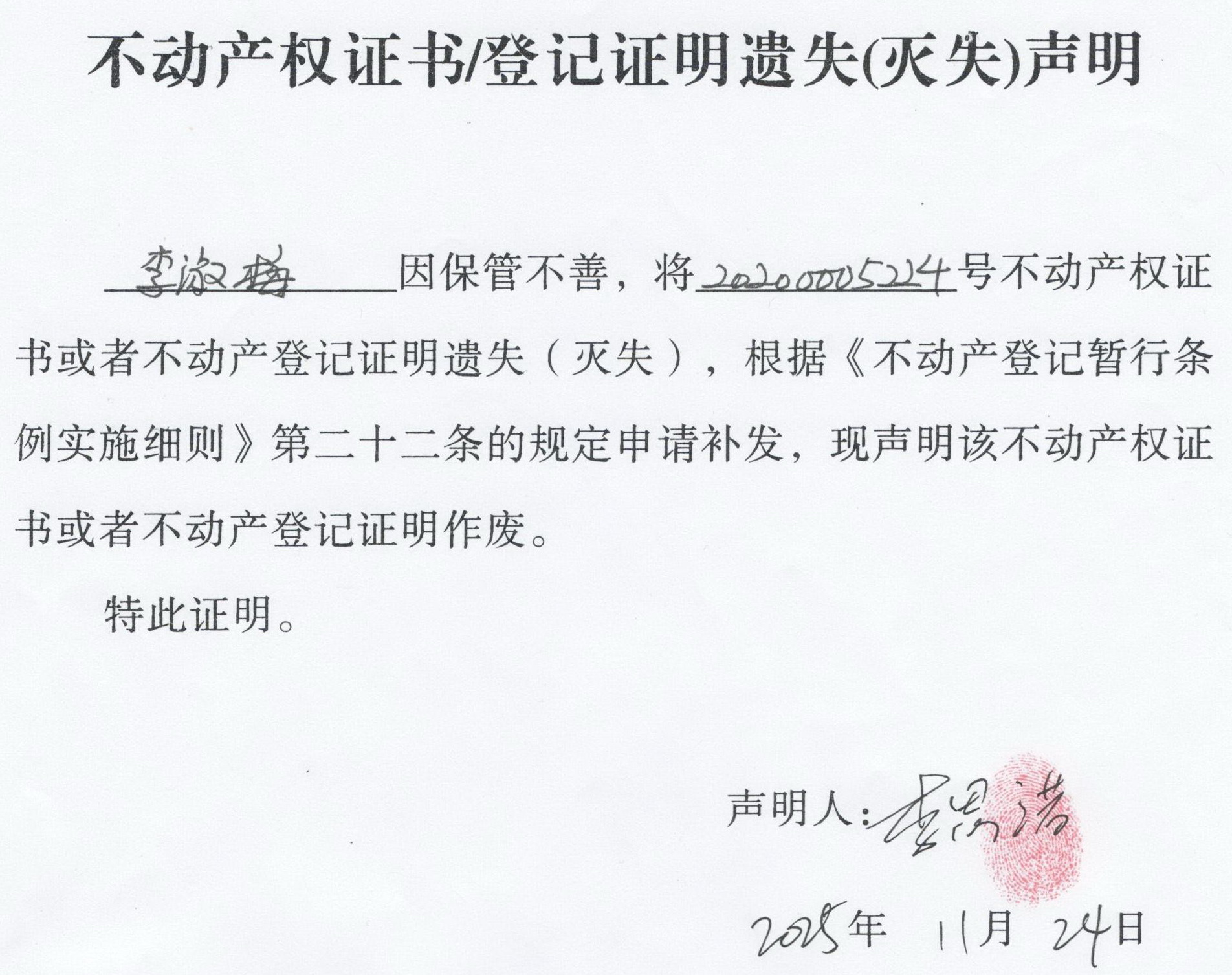 关于 李淑梅 不动产权证书/登记证明 遗失(灭失)声明