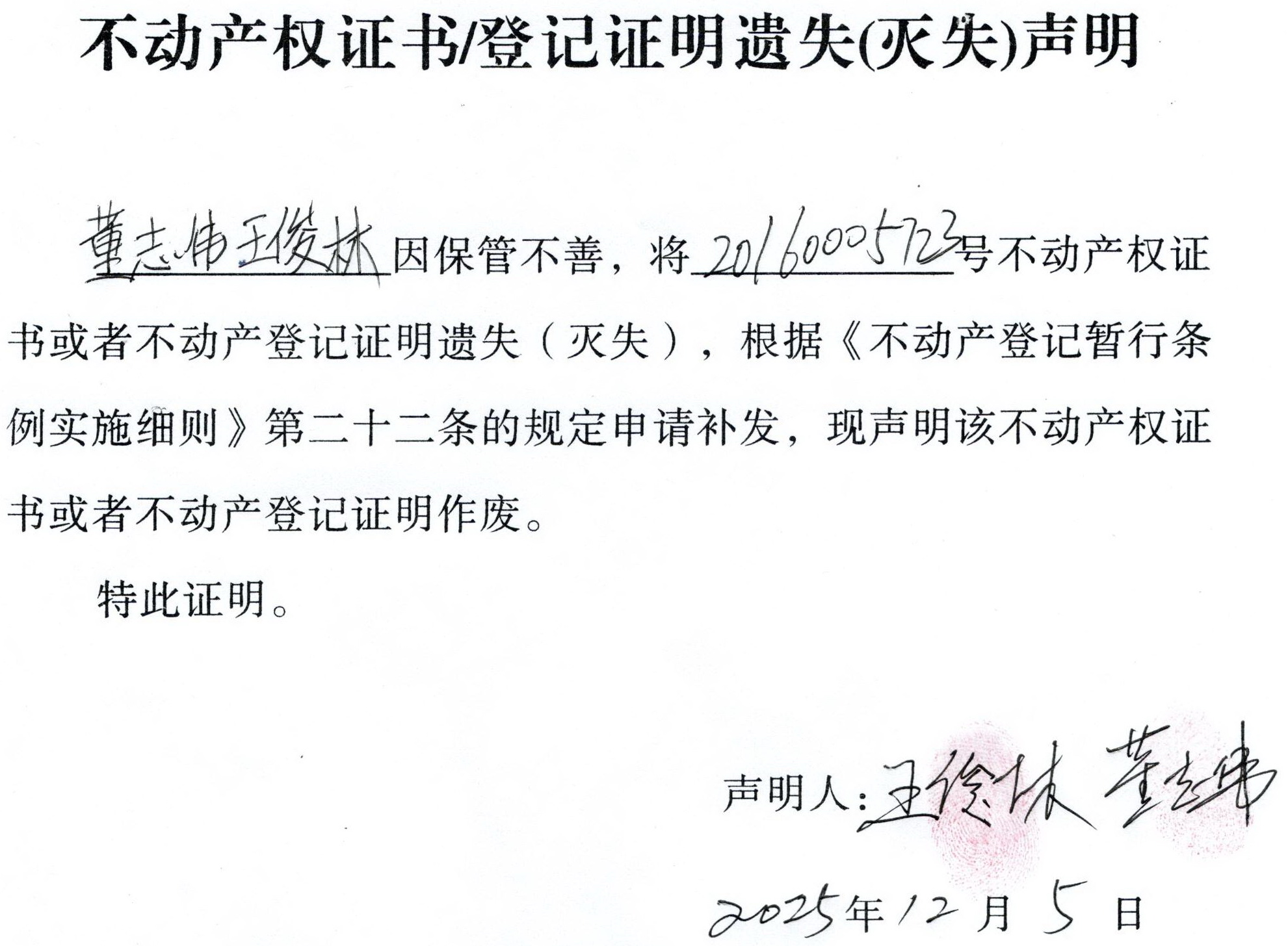 关于 董志伟、王俊林 不动产权证书/登记证明 遗失(灭失)声明