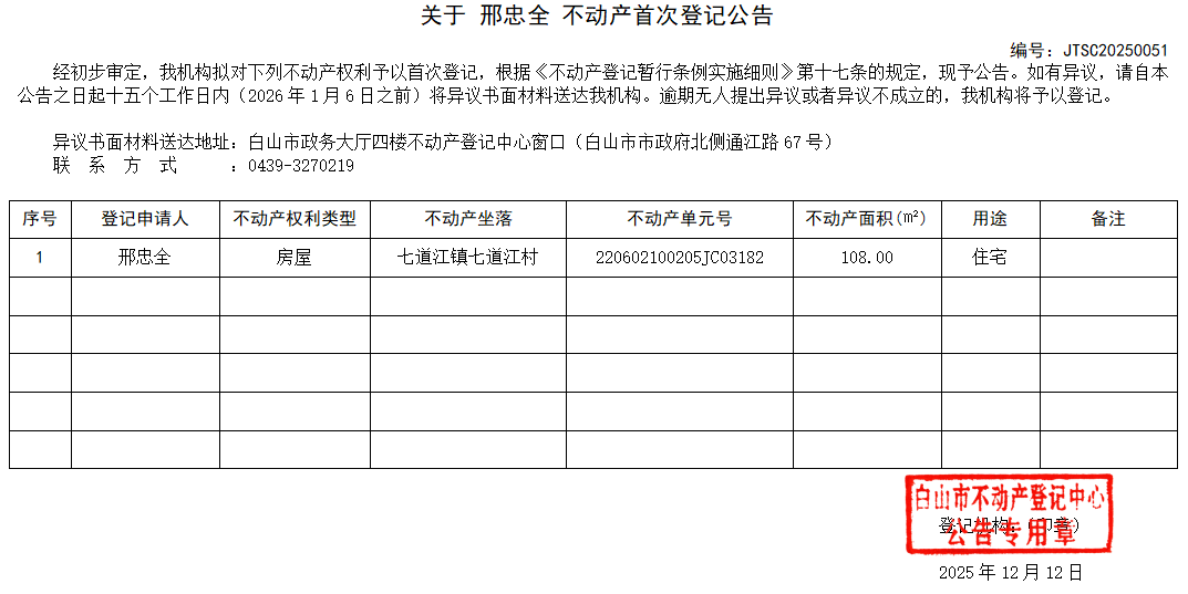 发布时间:2025-12-12 信息来源:白山市不动产登记中心 收藏