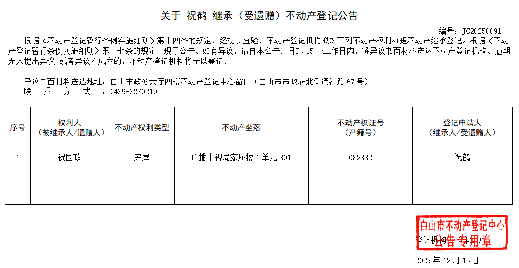 发布时间:2025-12-15 信息来源:白山市不动产登记中心 收藏