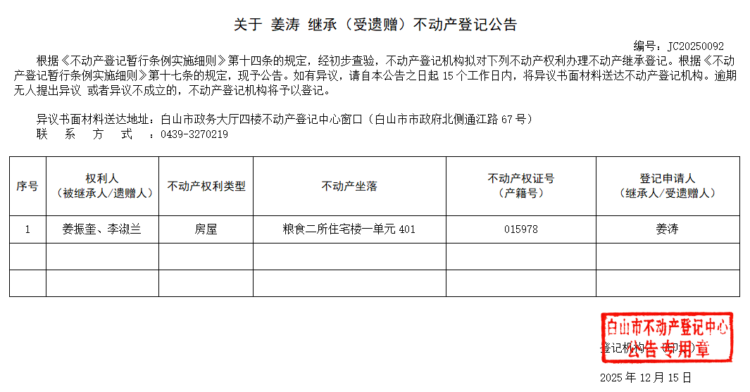 关于 姜涛 继承(受遗赠)不动产登记公告