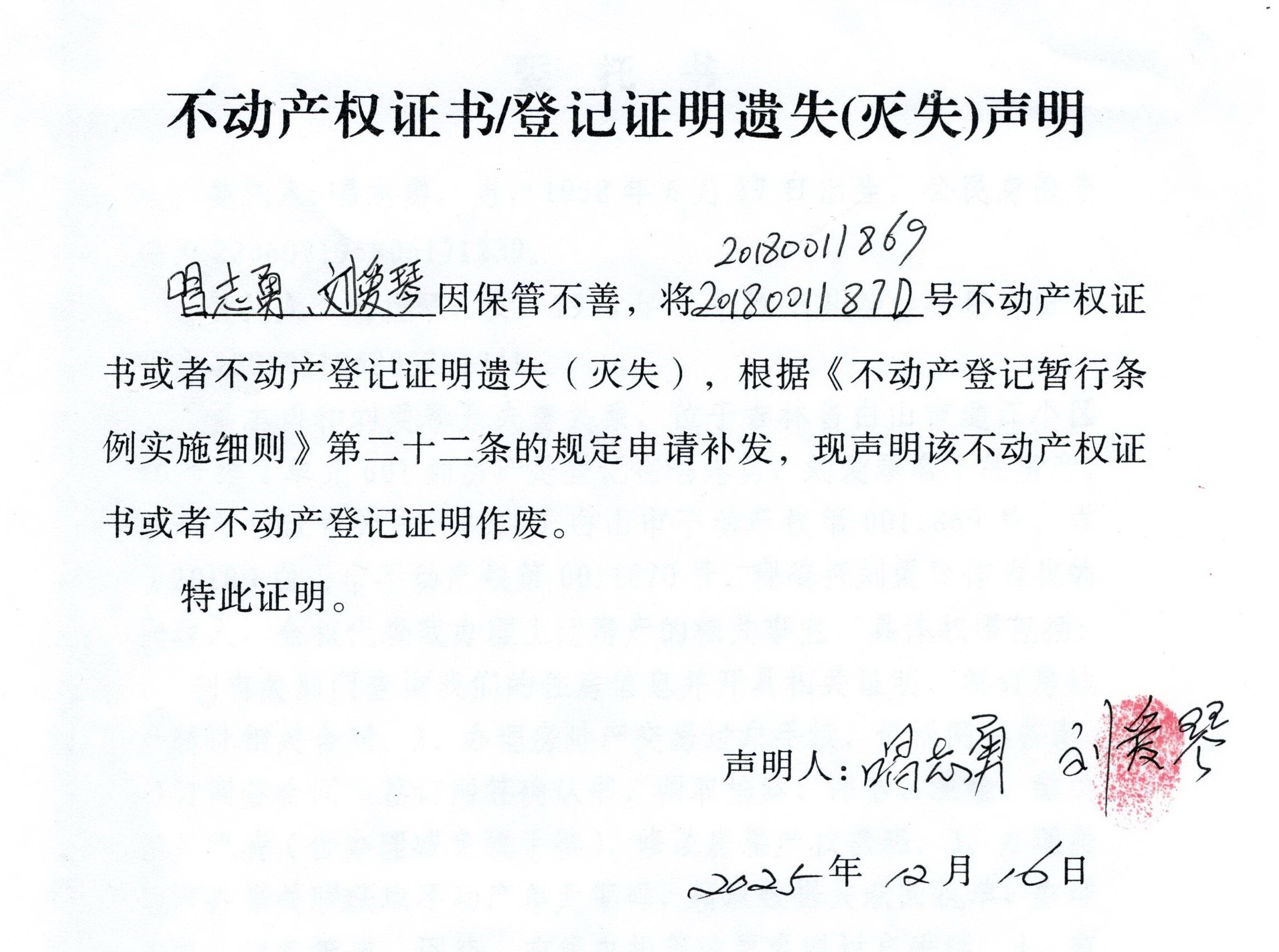 关于 唱志勇、刘爱琴 不动产权证书/登记证明 遗失(灭失)声明