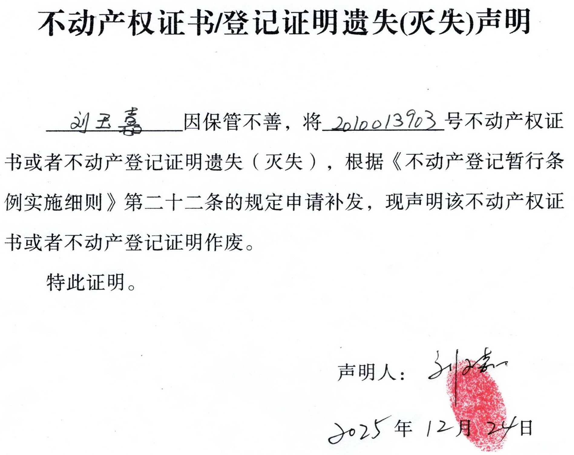 关于 刘玉嘉 不动产权证书/登记证明 遗失(灭失)声明